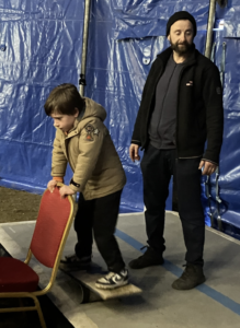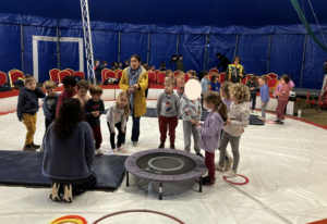 Vendredi 13, nous découvrons les ateliers dits “aériens ” : le tissu, avec Charlie et le trapèze, avec Jordan. Jean Jean nous initie à l’art clownesque et Samuel nous perfectionne au hula hoop.