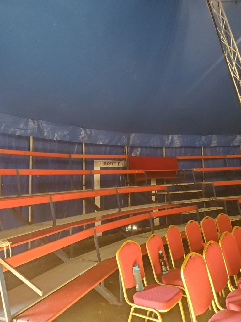Les gradins sont montés ! Le jour du spectacle approche ! Aujourd’hui jeudi, au programme : on s’entraîne et on fait une répétition sous le chapiteau. Vendredi, c’est la générale : on enchaîne les numéros et on réajuste les derniers détails avant les spectacles de ce soir ou samedi après midi !